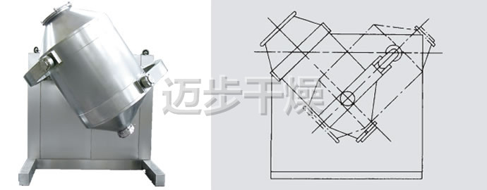 装料的筒体在主动轴的带动下,作周而复始的平移、转动和翻滚等复合运动,促使物料沿着筒体作三向复台运动,从而实现多种物料的互相流动、扩散、积聚、掺杂.以达到均匀混合的目的。